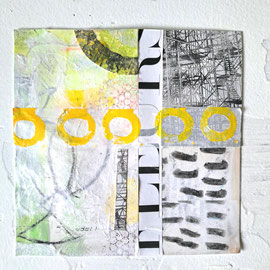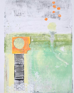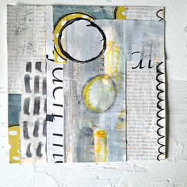 Verwendete Materialien: Gelliprints, Papierschnipsel, Acrylfarbe und u.a. Tempera, Graphitstift, Stempel, Ölkreide