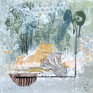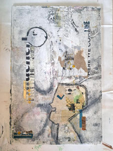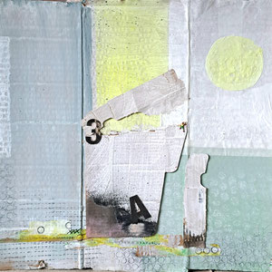 Verwendete Materialien: Gelliprints, Papierschnipsel, Acrylfarben und u.a. Ölkreide, Metallfolie, Foto-Negativ, Pappe